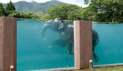Слоны очень любят плавать, это гигантские любители воды. Для пяти великанов и был построен большой водоем. Шестьдесят пять метров в длину и три метра в глубину. Постройка воздвигнута из прозрачного акрила, чтобы зрители могли видеть, как плавают толстокожие животные.